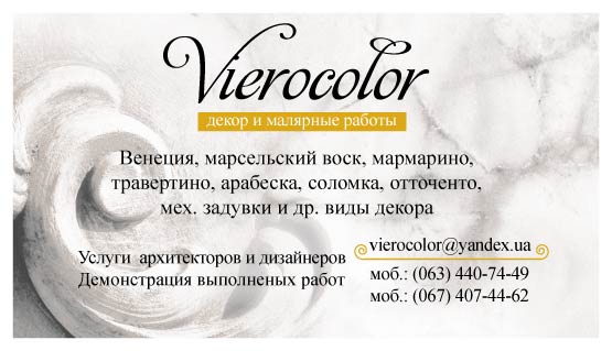 Компания «Vierocolor» предоставляет услуги декоративно-отделочных работ: венецианская штукатурка, марсельский воск, мармарино, отточенто и др. виды декора. Услуги архитекторов и дизайнеров. www.vierocolor.kiev.ua