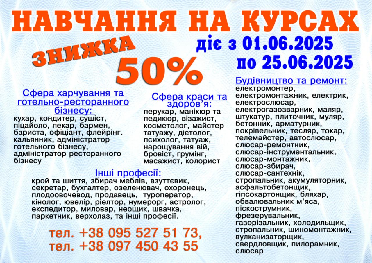 кухар, кондитер, сушіст, піцайоло, пекар, бармен, бариста, офіціант, флейрінг. кальянник, адміністратор готельного бізнесу, адміністратор ресторанного бізнесу