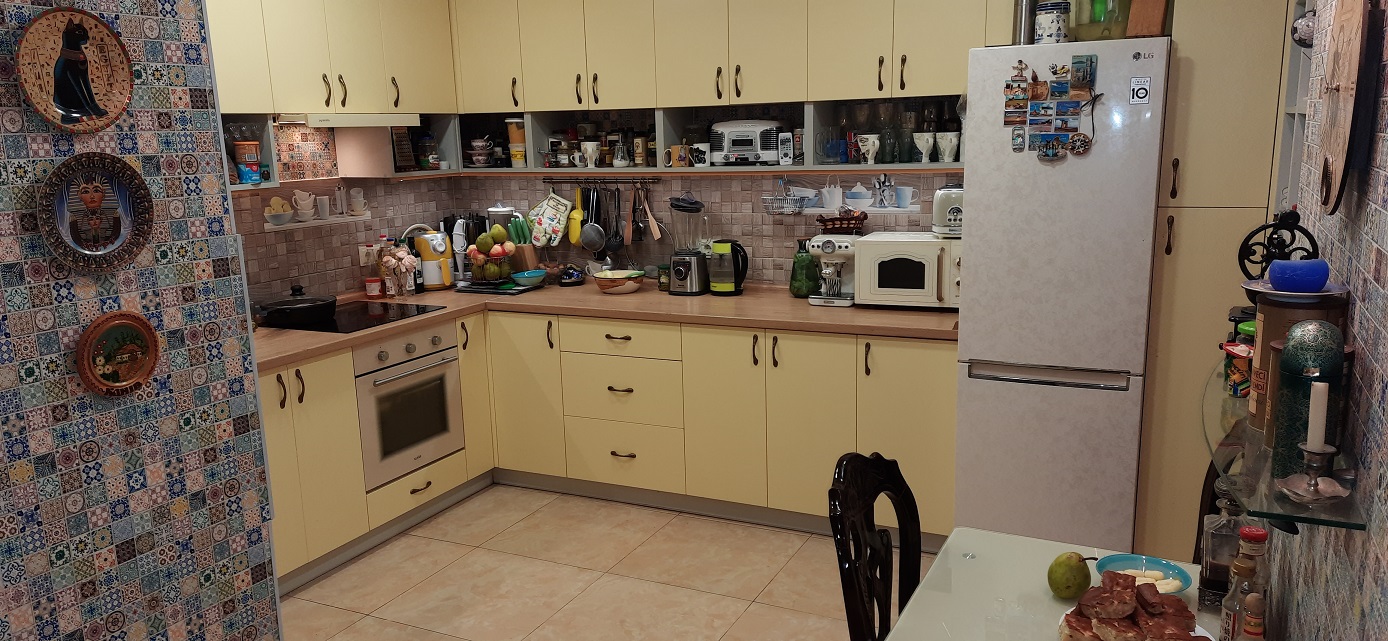 Стиральная машина встроена в кухню. Есть место для посудомойки.