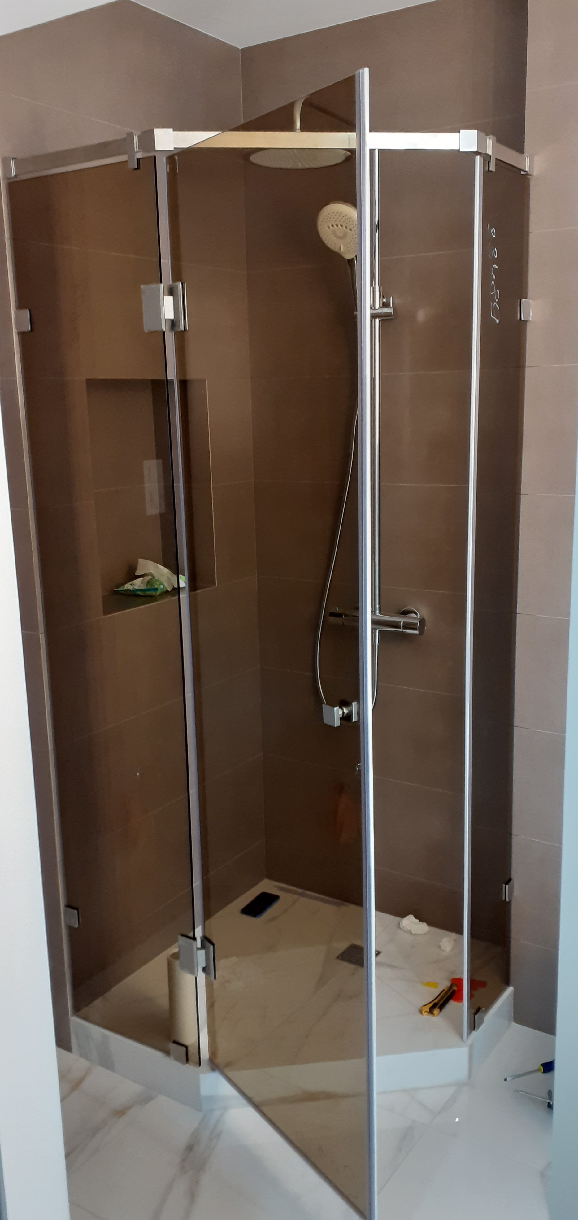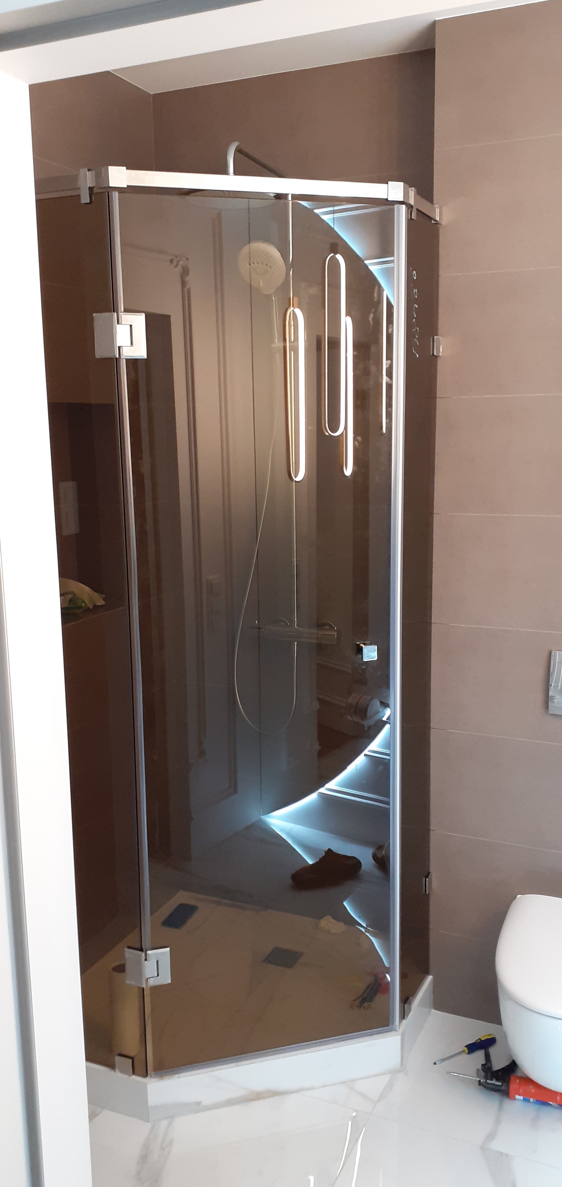 Виготовлення скляних душових перегородок, скляних кабін, дверей в душ, дзеркал, перегородок в ванних кімнатах за вашими індивідуальними розмірами. Вироби виготовляються з загартованого скла товщиною 4 -12мм. Скло може бути матованим з одного або двох сторін aбо пофарбоване по каталогу RAL. На скло можна нанести візерунок за вашими ескізами. Колір фурнітури хром, нержавіюча матова сталь, золото.