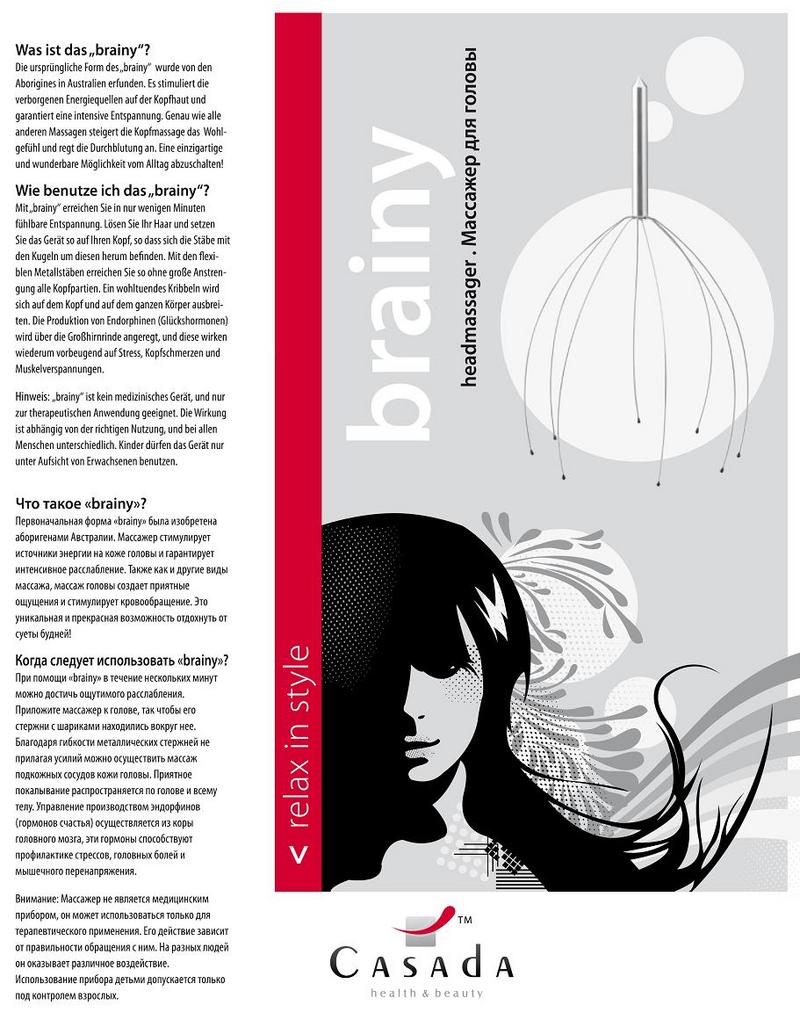 Вrainy - это совершено потрясающий массажер для головы, который в считанные минуты поможет Вам достичь полного расслабления и вернет утраченные силы и душевное равновесие. Невероятно приятные ощущения от внезапно возникающих и разливающихся приятным теплом по всему телу мурашек доставят Вам ни с чем несравнимое удовольствие. Массажер снимает накопленное рабочее и эмоциональное напряжение, расслабляет мышцы головы и тела, облегчает головную боль, а также придает силу волосам и ускоряет их рост. Головной мозг усиленно снабжается кислородом, ослабляется головная боль. Это компактное и простое устройство, пришедшее в современный мир с древнего востока, будет радовать вас день ото дня. Вrainy идеально подходит как недорогой, но полезный и приятный подарок. Вы можете подарить забавный и полезный сувенир как своим родственникам, так и коллегам по работе. Ведь каждый, кто получит такой подарок, оценит Вашу заботу о его здоровье и отличном самочувствии.