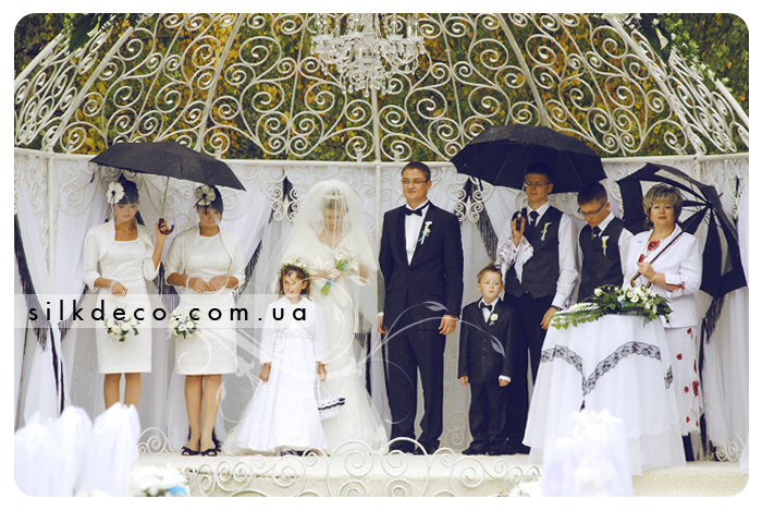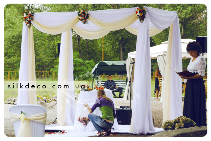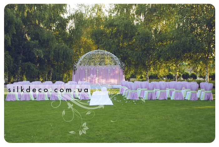 Если вы решили провести выездную регистрацию на природе, то здесь лучше всего использовать беседку или сцену, украшенную тканью и цветами.
