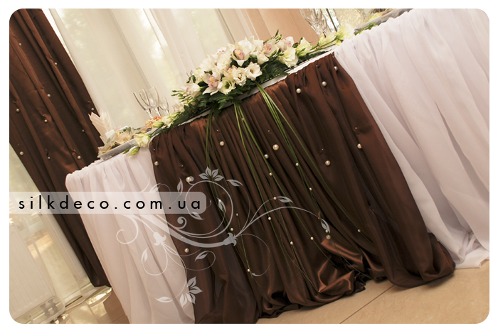 - Стол молодых. Он покрывается длинной скатертью до пола (иногда переходящей на пол), драпируется фалдами или интересными композициями.