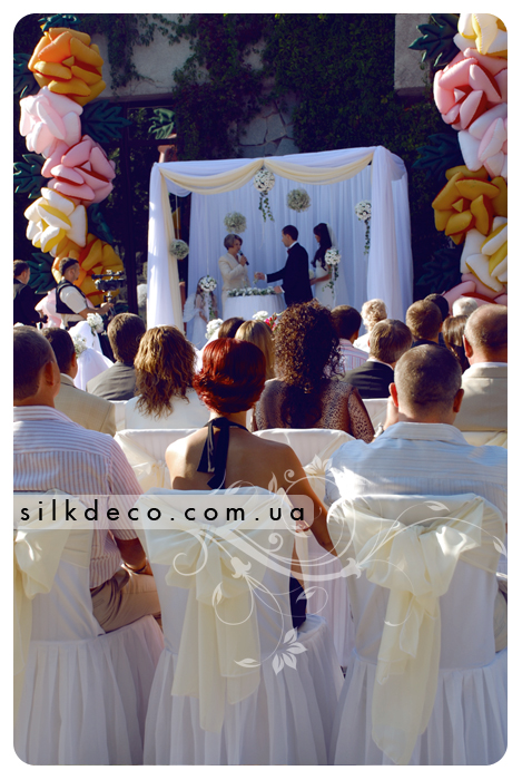 - Стулья "одеваются" в белоснежные чехлы и украшаются бантами, накидками, шалями, декоративными композициями или же живыми цветами.