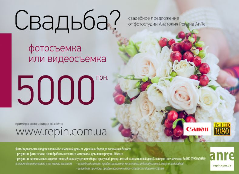 Также обращаем Ваше внимание на то, что до конца этого года действует наше акционное Свадебное Предложение - фото и видеосьемка свадьбы по цене 10 000 грн, при заказе свадебного предложения, свадебный макияж и прическа невесте идут в подарок. Также предоставляется скидка 50 % на фото или видеосъемку Love Story. Наши работы по фото и видеосъемке а также по макияжу и прическам можно посмотреть на сайте: http://repin.com.ua/