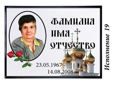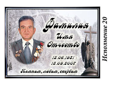 Наша организация занимается изготовлением фото на памятник, фотокерамики на памятник в Киеве, фото на керамике, таблички на памятник, ритуальных табличек в Киеве. В нашей фирме стоит высокопроизводительная немецкая линия по изготовлению фото на памятник и табличек на памятник. Фотокерамика, изготовленная на нашем оборудовании проходит обжиг при 850 градусах Цельсия, в результате чего фотокерамика и фото на памятник обладают высокой долговечностью, не выгорают на солнце, стойкие к покрытию льдом и резкой оттепели. Мы предлагаем Вам большой выбор вариантов исполнений для табличек на памятник и ритуальных фото и табличек.