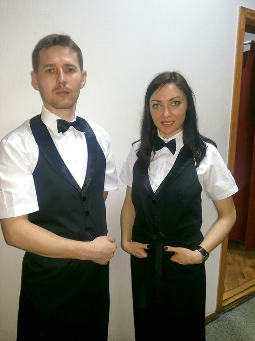 Форма для официантов должна быть удобной и практичной. Изготавливается из тканей, соответствующих санитарным нормам (сорочка, костюмная и пр.).