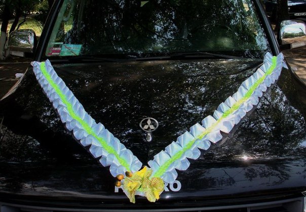 Свадебное украшение на авто в прокат. Украшения ручной работы: кольца на прокат от 100грн, ленты на капот от 50грн, бутоньерки от 100грн, композиции на капот от 100грн, прокат 3дня + залог.