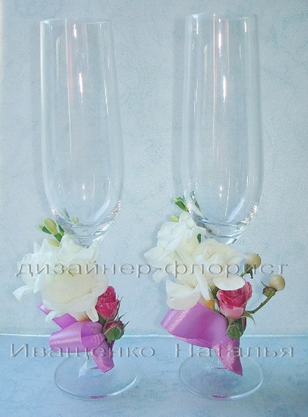 Оформление свадебных бокалов живыми цветами под заказ, украшение цветами в разных стилях, цена от 150грн пара. Яркие украшения декором и цветами в нужном стиле.