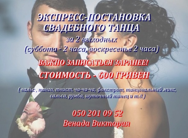 Быстрая постановка свадебного танца за 2 выходных (2 часа - суббота, 2 часа - воскресенье) стоимость 600 гривен.